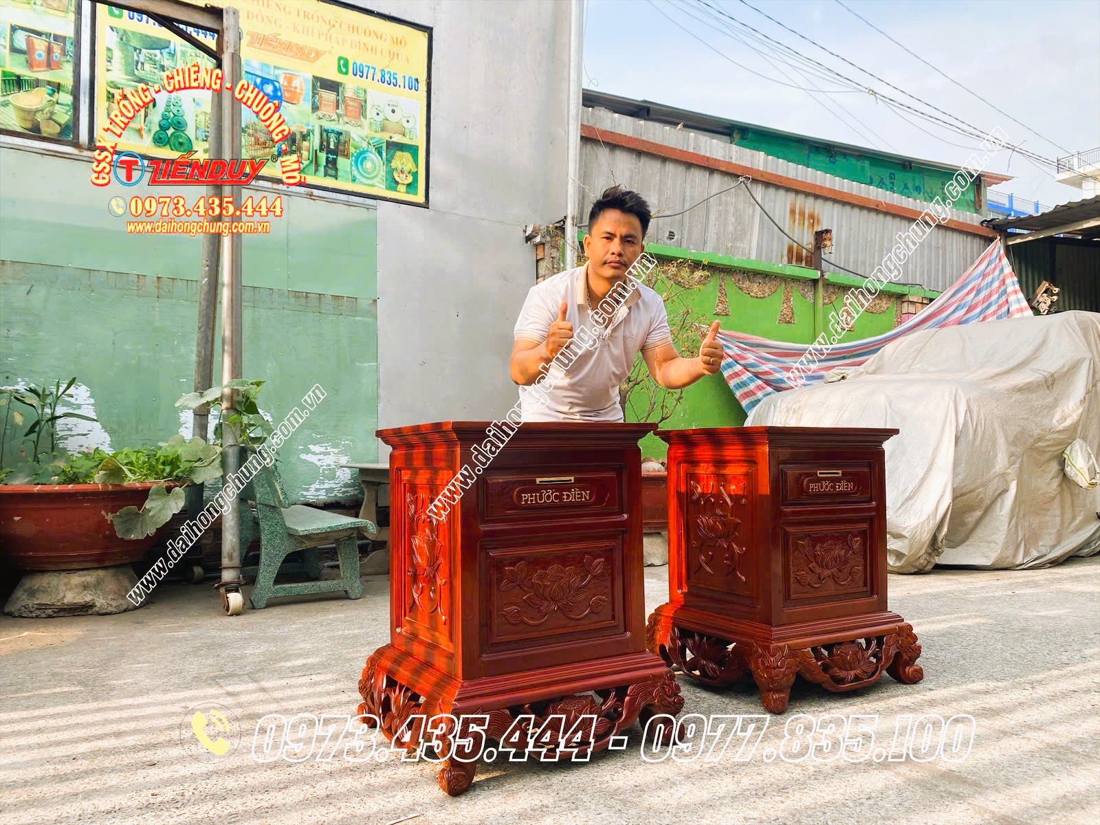 Cơ Sở Chiêng Trống Chuông Mõ Tiến Duy sản xuất bàn Thùng Phước Điền bằng gỗ căm xe, lim chạm khắc 3 mặt sâu sắc nét, gỗ dày dặn chắc chắn dùng để ở chánh điện Tam Bảo ở Chùa, Đình, Đền.